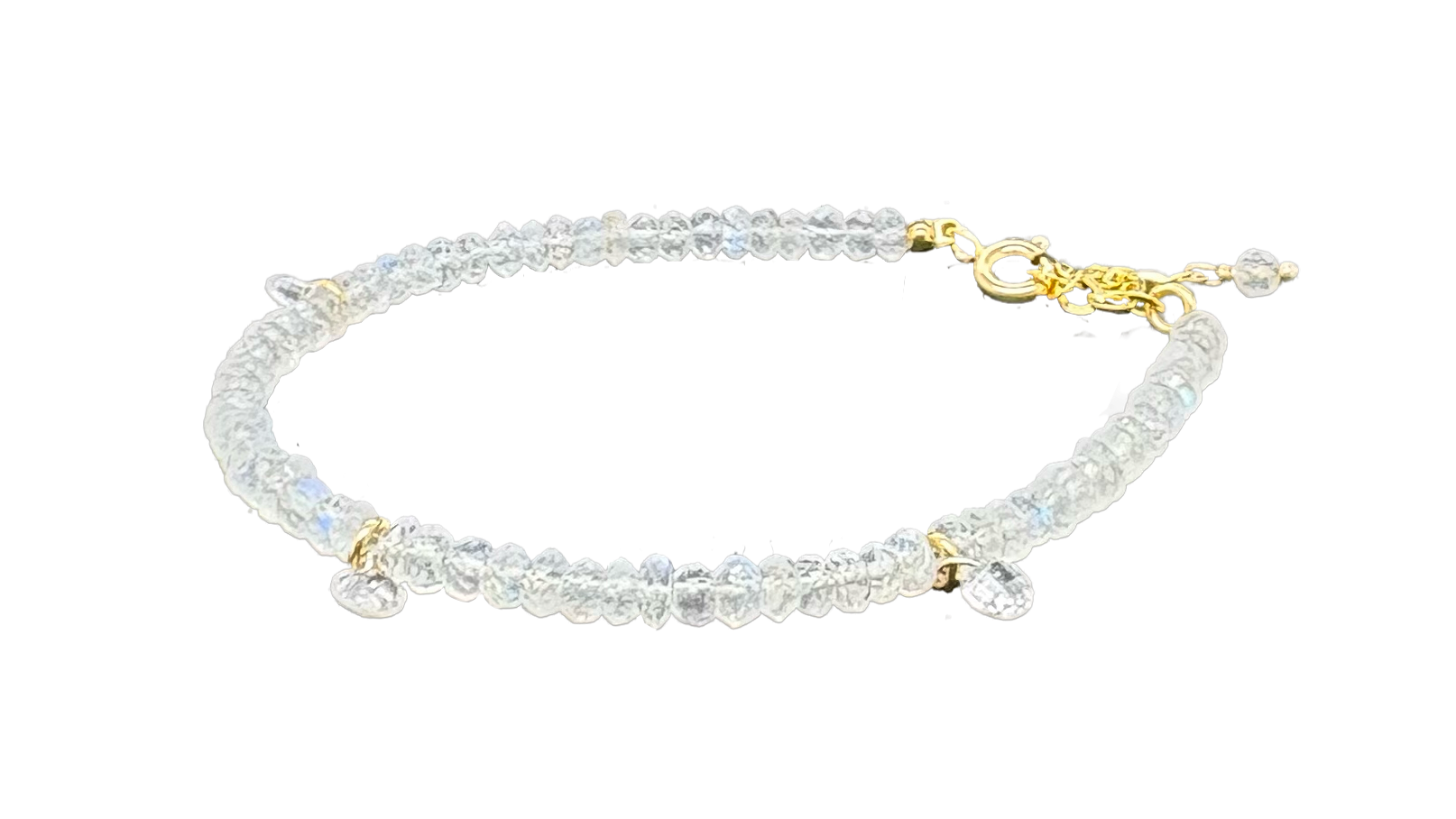 Et smukt og feminint armbånd i forgyldt Sterling sølv, udsmykket med 3mm facetterede Moonstone perler, der changerer i bløde toner af hvid og blå, alt efter lysets spil.